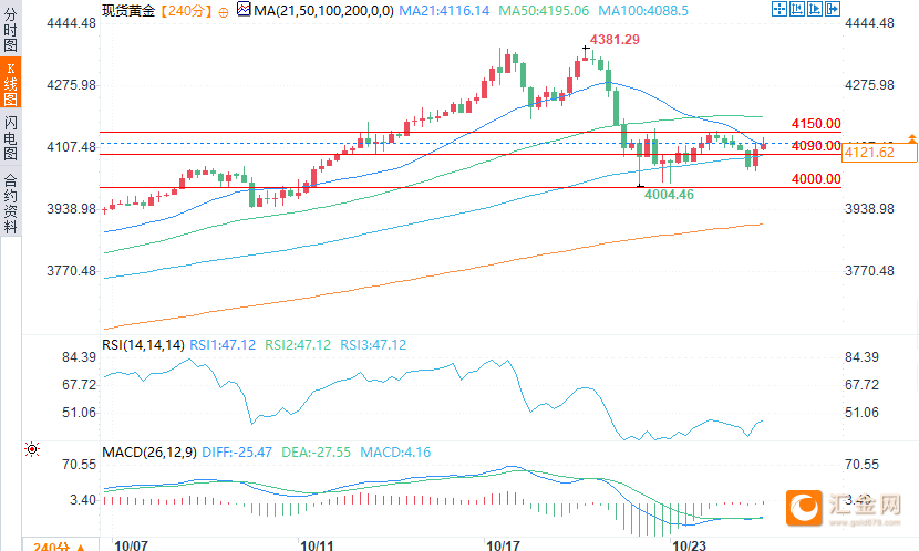 周五(10月24日),现货黄金出现反弹,在美国消费者物价指数(CPI)数据弱于预期后,盘中跌幅收窄。现货黄金盘中报4123.7美元左右,从盘中低点4044美元附近回升,不过金价仍有可能结束其连续九周的上涨势头。