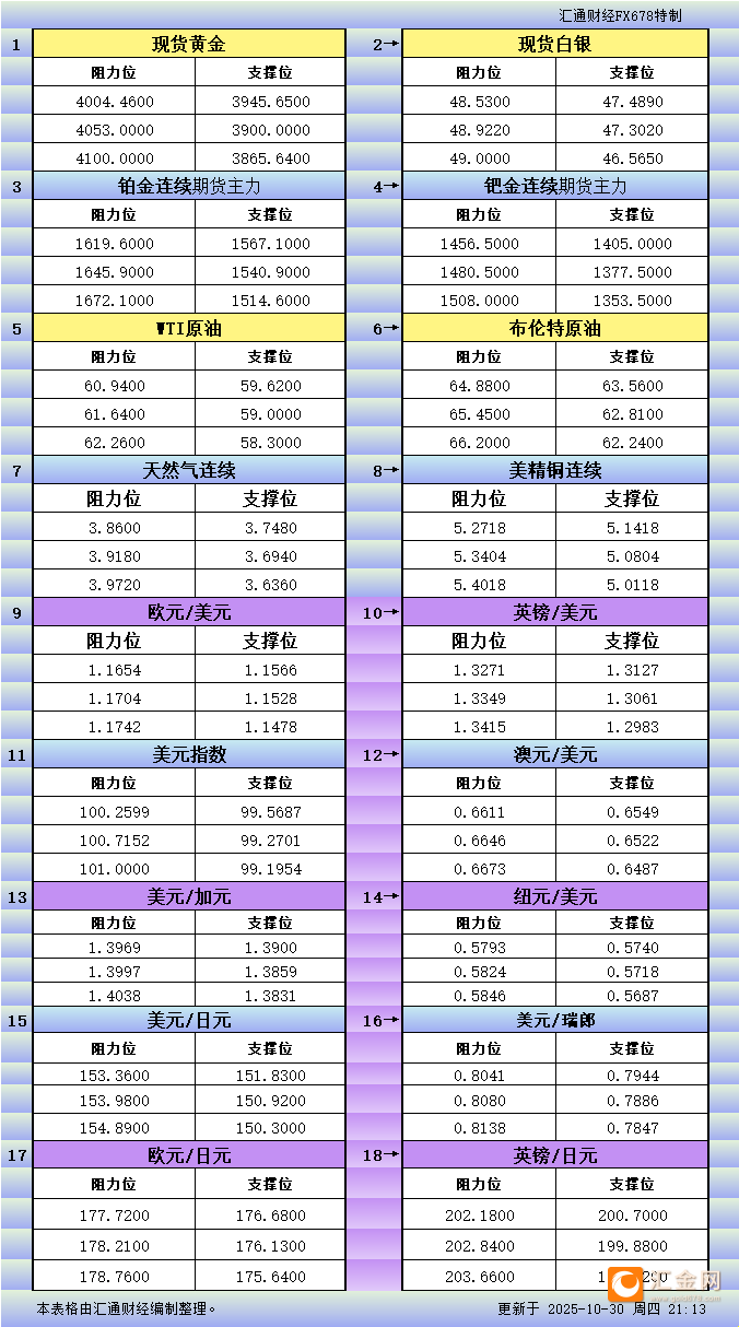一张图:2025年10月30日黄金原油外汇股指“枢纽点+多空持仓信号”一览。今日(2025年10月30日周四)最新出炉的数据显示,截止刚刚,本图表中,最新处于“超买”状态(多头超过80%)的有:5 个品种,最新处于“超卖”状态(多头不足20%)的有:5 个品种。其中,多头头寸占比最高的是:纳斯达克100 Nasdaq 100。现货黄金XAU/USD多头占比:60%,美国原油WTI OIL多头占比:85%,欧元兑美元EUR/USD多头占比:52%。这些品种较昨更的“变动信号”以及更详细的清单列表,详见汇通财经特制图表。
