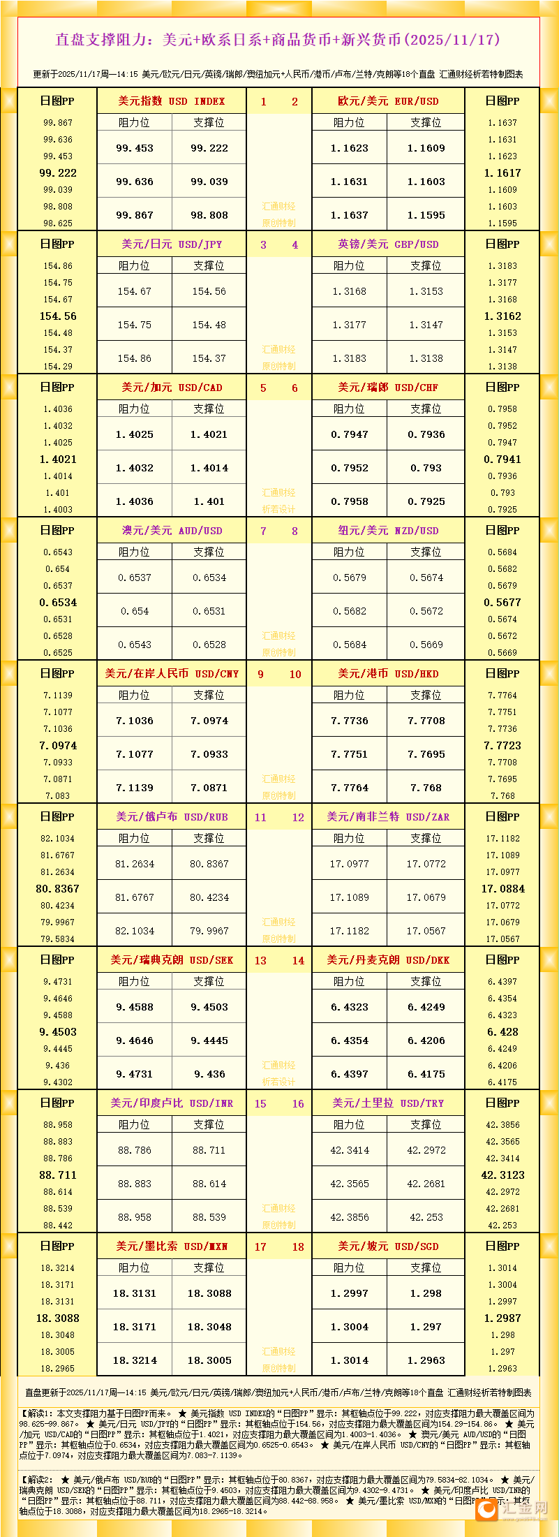 一张图看商品支撑阻力:金银油气+铂钯铜+农产品期货,更新于2025/11/17周一14:15,具体覆盖金银铂钯铜+原油天然气燃油+小麦玉米棉花14个品种,更多详见汇通财经析若特制图表中的内容。
