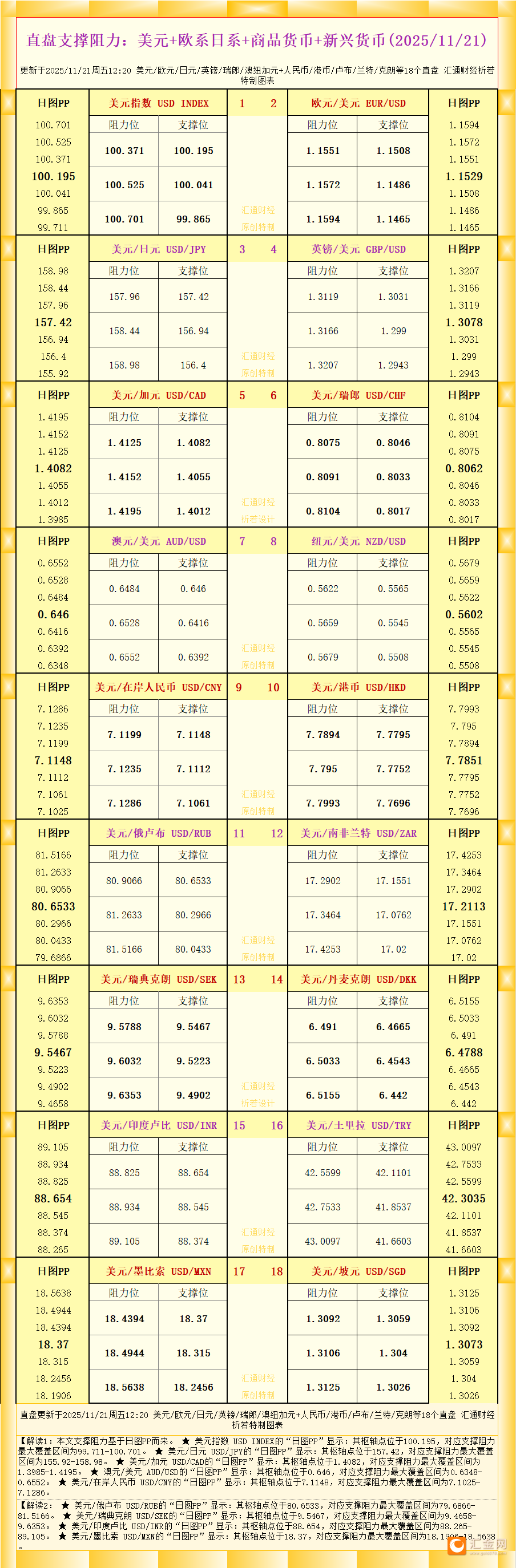一张图:2025年11月21日黄金原油外汇股指“枢纽点+多空持仓信号”一览。今日(2025年11月21日周五)最新出炉的数据显示,截止刚刚,本图表中,最新处于“超买”状态(多头超过80%)的有:3 个品种,最新处于“超卖”状态(多头不足20%)的有:6 个品种。其中,多头头寸占比最高的是:富时中国A50 ☆FTSE China A50。现货黄金XAU/USD多头占比:70%,美国原油WTI OIL多头占比:87%,欧元兑美元EUR/USD多头占比:63%。这些品种较昨更的“变动信号”以及更详细的清单列表,详见汇通财经特制图表。