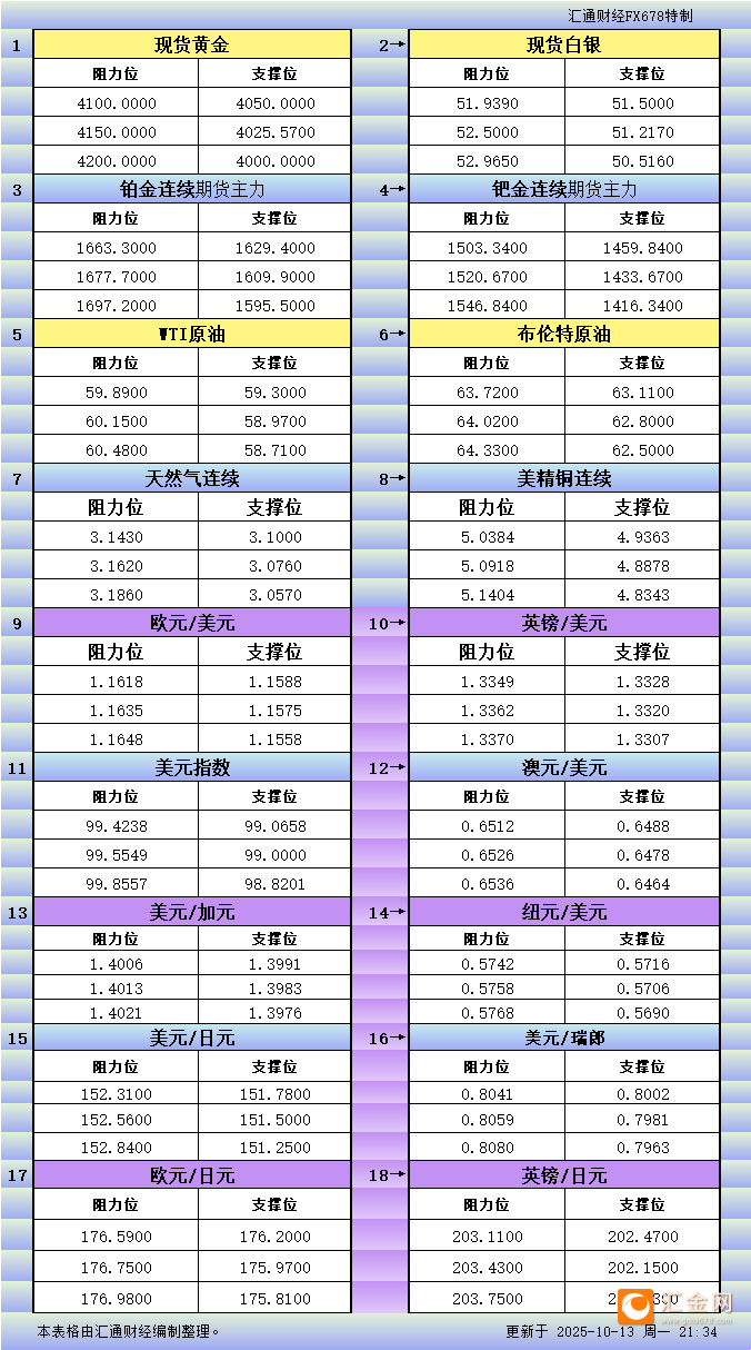 纳斯达克指数刚刚突破22500.00关口,最新报22499.98,日内涨1.33% 10-13 21:36:16 10月13日美市更新支撑阻力:18品种支撑阻力(金银铂钯原油天然气铜及十大货币对) 10-13 21:35:56 现货铂金刚刚突破1640.00美元/盎司关口,最新报1639.83美元/盎司,日内涨1.72%; Nymex铂金期货主力最新报1678.0美元/盎司,日内涨3.39%; 10-13 21:32:05 道琼斯工业平均指数日内涨幅达到1.01%,报45936.81 10-13 21:32:05 道琼斯工业平均指数刚刚突破45900.00关口,最新报45902.59,日内涨0.93% 10-13 21:31:45 纳斯达克指数刚刚突破22600.00关口,最新报22600.43,日内涨1.78% 10-13 21:30:55 纳斯达克指数日内涨幅达到1.71%,报22583.82 10-13 21:30:24 标普500指数日内涨幅达到1.17%,报6629.10 10-13 21:30:15 【法国新内阁火线就位,政治风暴中艰难启航】 ⑴ 法国新一届内阁于周一举行首次工作会议,总理勒科尔尼明确表示,政府当前“最主要的任务”是“渡过这场政治危机”。 ⑵ 正在埃及访问的总统马克龙同日呼吁各党派“为了稳定而努力”,试图为紧张政局寻求缓和空间。 ⑶ 新政府组建仅一天便面临严峻挑战,极右翼政党“国民联盟”和左翼政党“不屈的法兰西”已向国民议会提交对政府的不信任动议。 ⑷ 政治不确定性持续笼罩市场,投资者担忧政府运作效率可能因议会僵局而严重受损。 ⑸ 勒科尔尼于上周日公布新内阁名单,此次工作会议标志着新政府正式启动运作程序。 ⑹ 市场密切关注不信任动议后续进展,这将成为检验新政府稳定性的首个关键考验 10-13 21:27:23 特朗普离开以色列前往埃及沙姆沙伊赫参加峰会 10-13 21:26:42