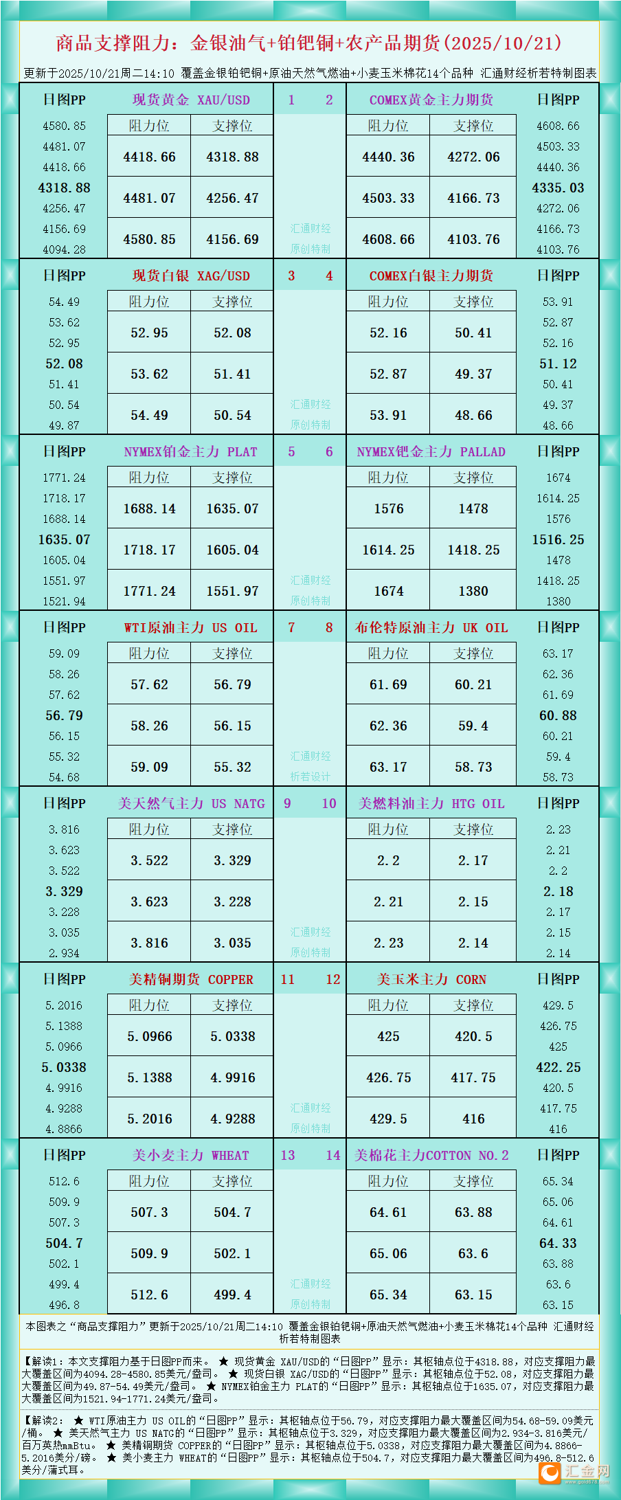 一张图看商品支撑阻力:金银油气+铂钯铜农产品期货(2025年10月21日)