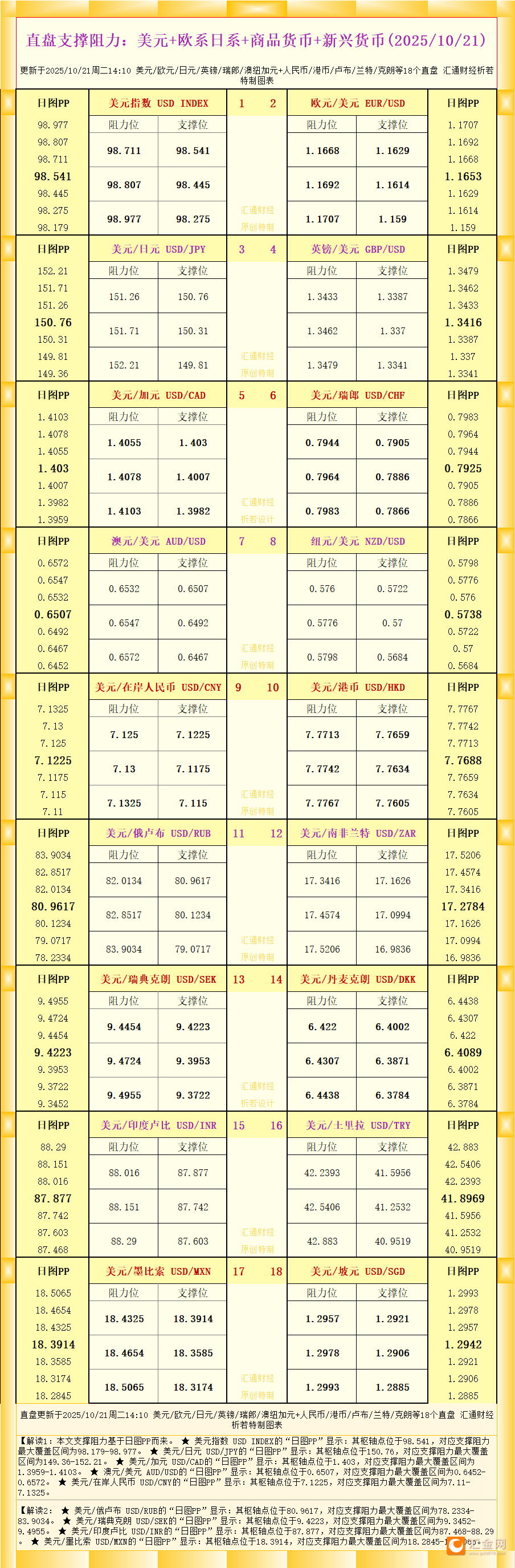 一张图看18个直盘外汇支撑阻力:美元+欧系日系+商品货币+新兴货币(2025年10月21日)
