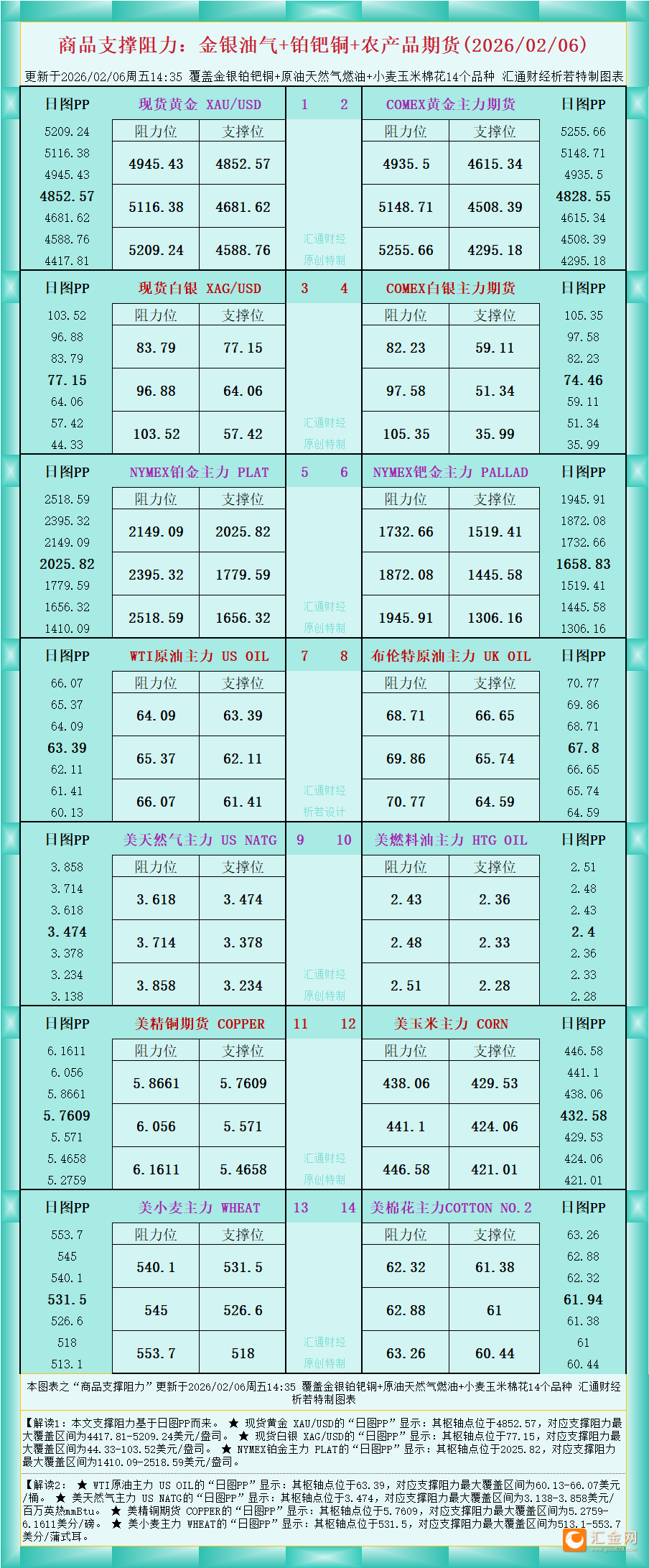 一张图看商品支撑阻力:金银油气+铂钯铜农产品期货(2026年2月6日)