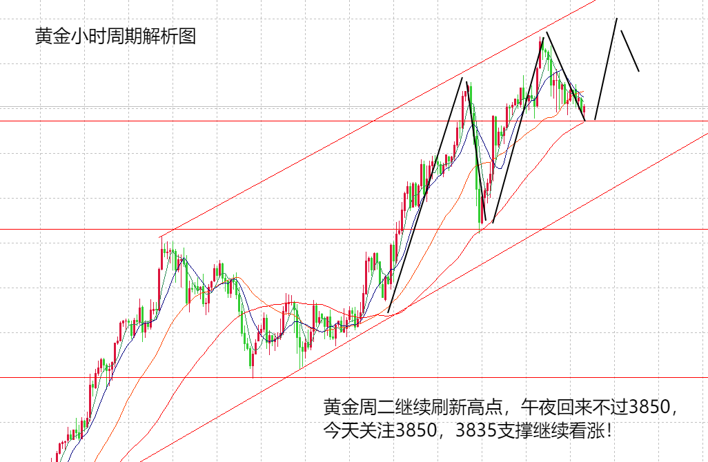 先说结论,黄金继续保持多头趋势看涨,交易依旧是回落做多。本周行情目前,周一,周二,周三都是阶段性上涨,并且在亚欧盘有新高,但美盘每次都给出了回落空间,周三在刷新高点至3895后,回落至3855附近,也算是给顺势做多的机会,所以,连续前三天的行情看,今天关注亚欧盘是否有新高的可能,如果按照前面的力度,每天都有接近80/100个点的空间,那么,在绝对的强势下,今天关注3935附近,当然,这种看法是没有太多的理由,全凭市场情绪。从技术面分析,日线周期虽然出现了调整空间,但在绝对的多头趋势之下,暂时没有破位5,10日均线的支撑,也就是说,暂时还是绝对强势,今天的支撑在5日均线3835,如果跌破3835,可能会考虑会有高位震荡表现,再看有力度的回落空间。H4周期则在高位有震荡表现,均线粘合,布林收口,就看今天是否有新高表现,如果破位新高,就再次形成单边强势,上涨不猜顶,但如果没有新高就以高位震荡看待。另外,小周期的支撑点在3850附近,所以,日内交易顺势多单在3850,3835两个点,继续上涨大概率在3900,3935两个点,亚欧盘看涨,美盘可能出现调整。