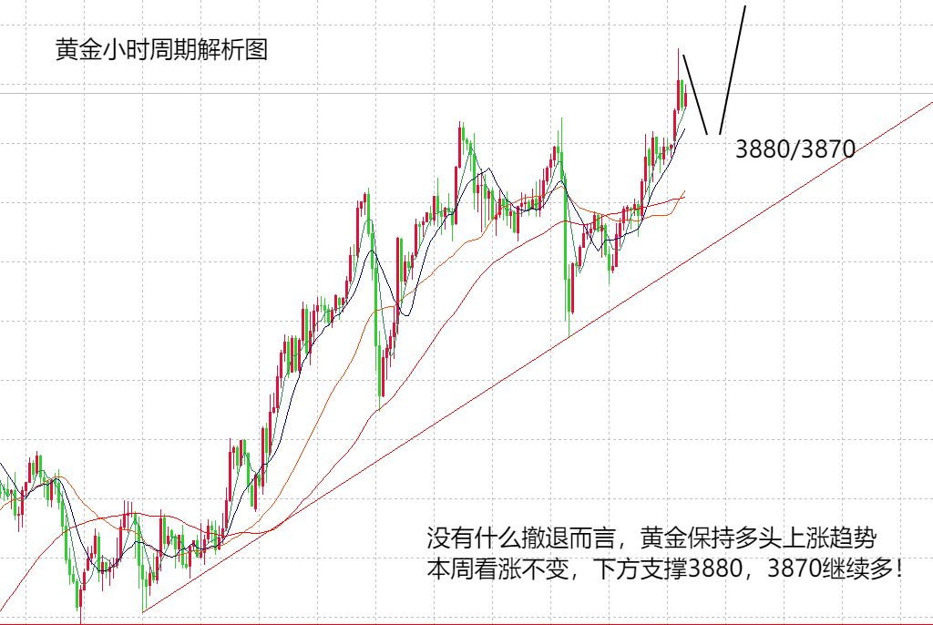 先说结论,黄金继续保持多头趋势看涨,交易依旧是回落做多,不追多。现在行情,每天都是历史性时刻,每个交易日都会创造历史,上周黄金,周一,周二出现单边上周,周三,周四,周五出现震荡上涨,我们基本抓住了多头趋势交易空间,取得了不错的成绩。本周继续保持多头趋势,看涨不变,周内维持看涨不猜顶,回落做多原则即可。现在黄金已经破位3900高点,继续看涨的话也就看到4000高点,当然这是一个预期,并没有什么具体的理由。周期性行情的节奏大概率保持上周不变,周一,周二看单边上周,周三,周四看震荡上涨或者市场有变盘的可能,周五则看修复性上涨,如果周三,周四变盘,周五则会大跌。从技术面来看,本周的强弱关键点在3820,趋势关键点在3750,也就是说,不破3820一定是强势上涨,不破3750就不考虑多空趋势转变。对于日内行情而言,黄金早间直接破位3900,目前最高在3920,原则上是看涨,但不能追涨,下方支撑在3880,3870区间,亚欧盘有可能直接上涨,但绝对不追多,还是等回落做稳健的多单才能安心,如果全盘给出关键支撑点的机会,就可以顺势做多,上方再看3920,甚至3950更高点。