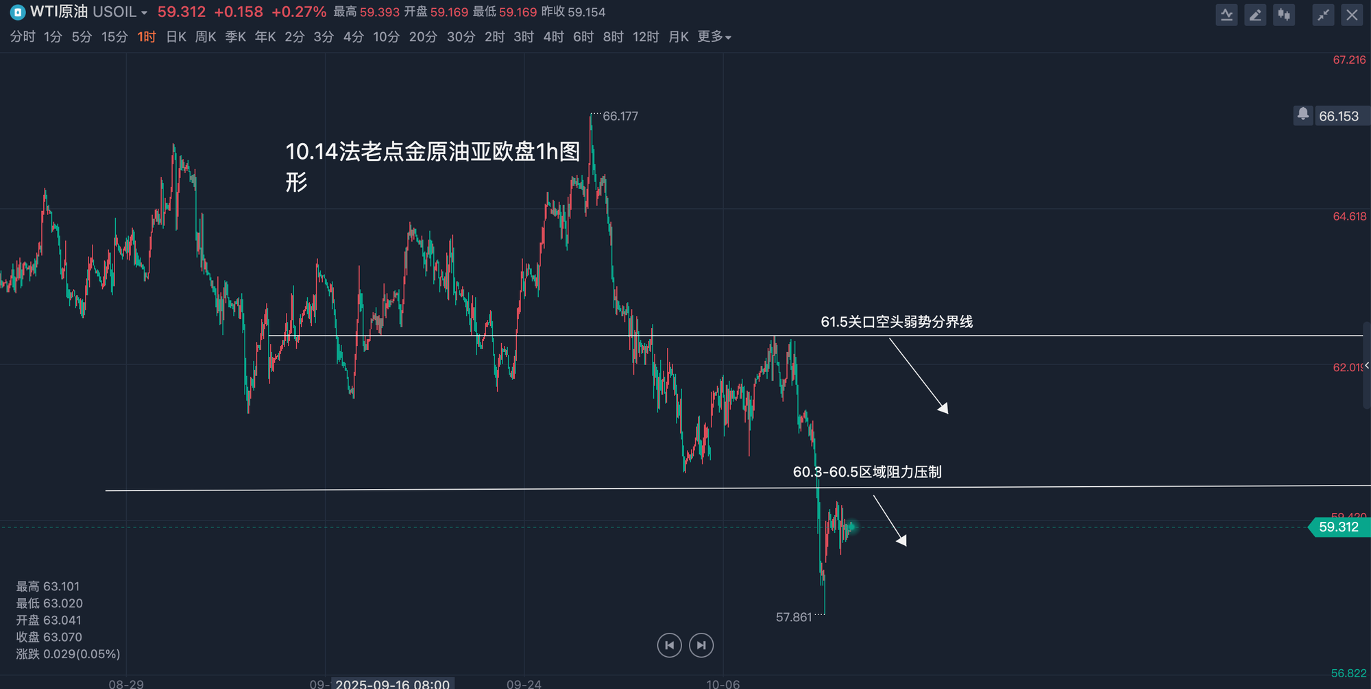 10-14[原油]10月14日【黄金原油】亚欧盘:原油日线级别连阴回落下行破底延续弱势空头,今日反抽依托60.3关口先空下看回落不变