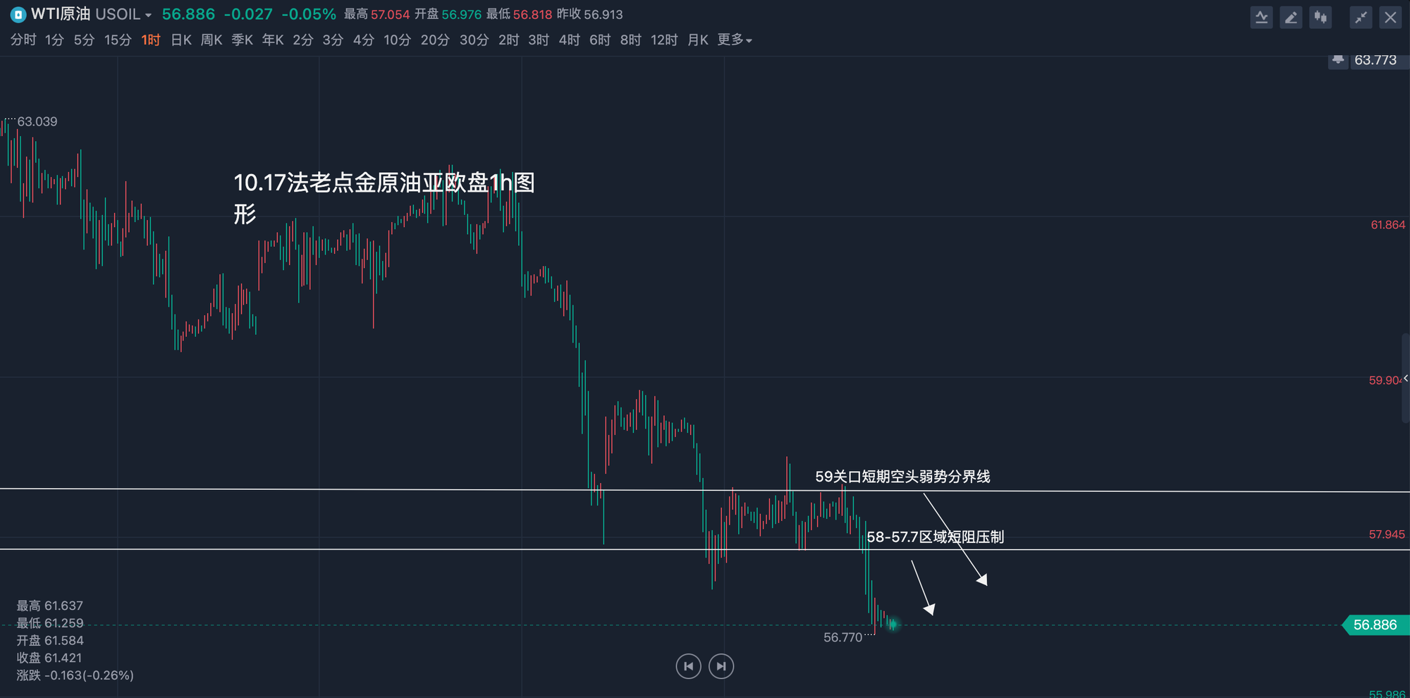 10-20[原油]10月20日【黄金原油】亚欧盘:原油日线级别连阴回落震荡下行破底呈现空头下行格局,今日反抽依托58关口继续主空顺势下看回落