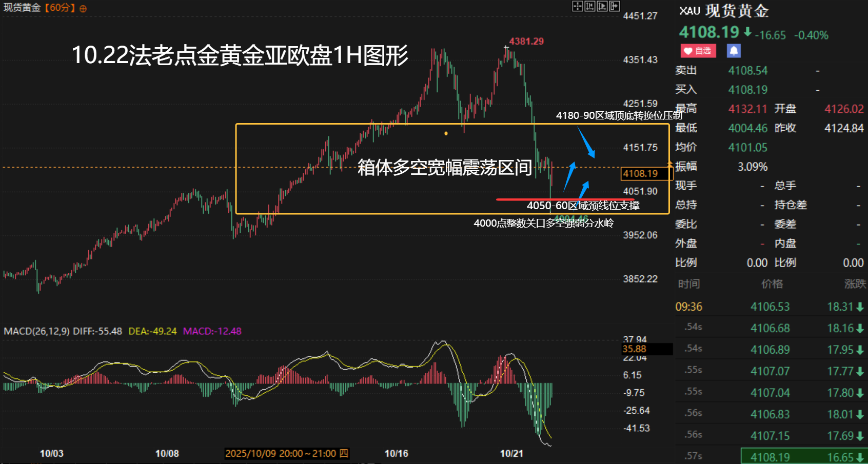 10-22[黄金]10月22日【黄金原油】亚欧盘:黄金昨日4253多一单到底扫止盈,亚盘深度回踩测试4000点关口支撑,今日依托此位置得失做跟随