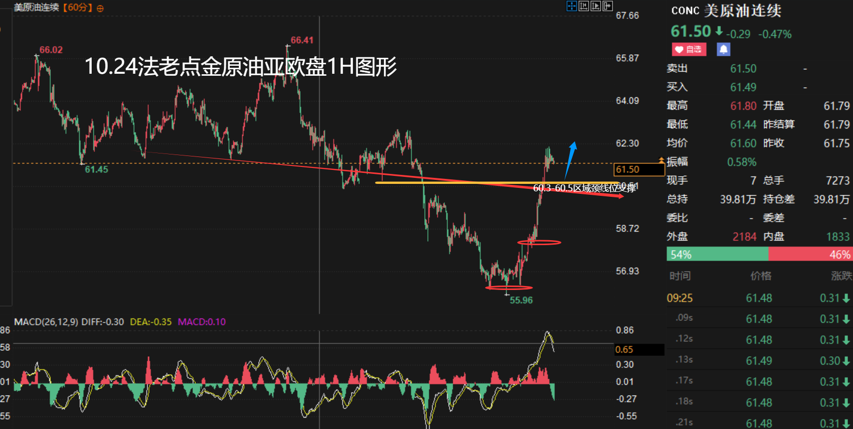 10-24[原油]10月24日【黄金原油】亚欧盘:原油昨日依托59关口延续多头强势反弹上行破高重回61关口,今日回踩依托60.3关口继续先多再看反弹上行延续