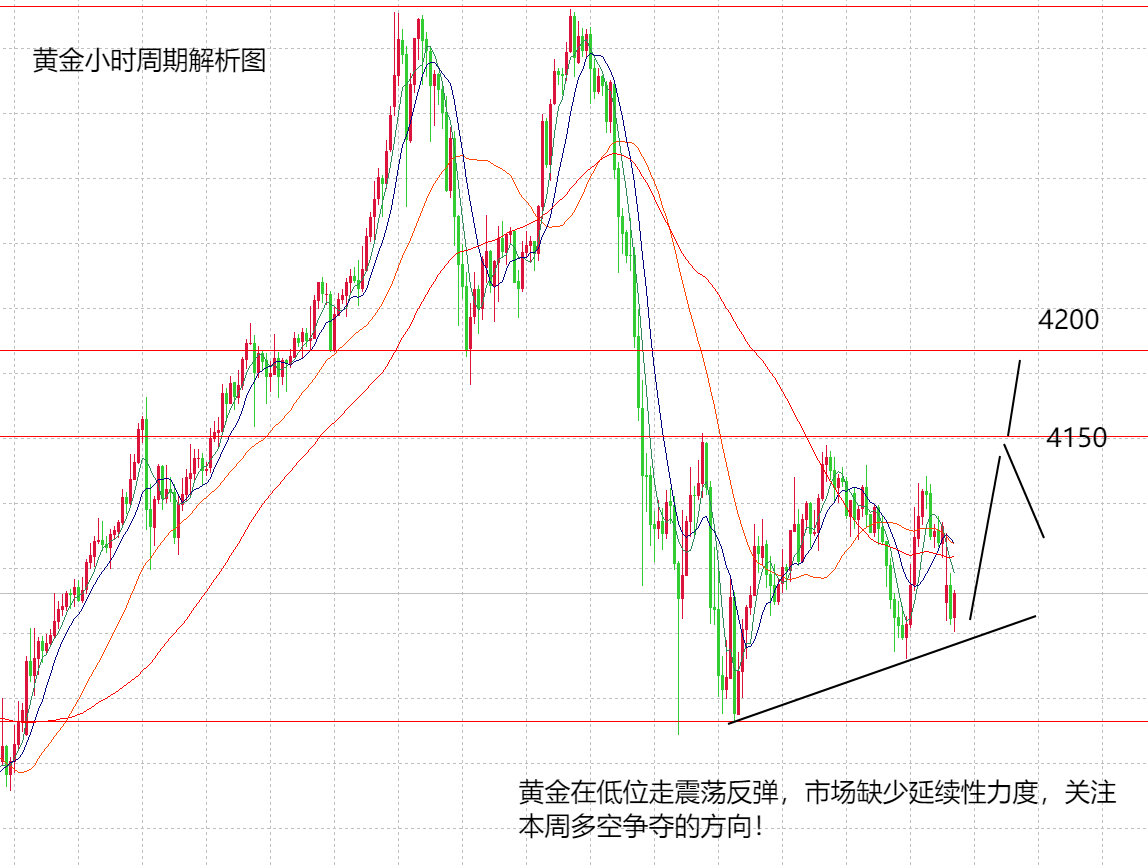 本周黄金简单来看,在上周黄金大跌后,黄金进入了一个震荡区间的走势,上方高点4150难以破位,下方4000关口也多次试探不破,所以,暂时黄金形成了4150/4000的区间震荡范围,本周如果不破此区间,就不看单边走势,如果破位此区间则看多空的延续性,按照现在多头趋势不变的条件来讲,上方继续看到4200,4250,4300,趋势不猜顶,但一旦破位4000关口,也要大大方方看空头的翻盘力度,下方或看到3850。所以,本周黄金重点不是说一定要判断和多空方向,而是要关注关键点位破位后的行情。也就是说,在4150/4000不破的情况下,继续在区间内做有效的多空交易,破位后再看市场的延续性,预计周三,周四行情会有破位的可能。从技术面来看,日线上周大阴收跌,但始终没有跌破5日均线的支撑,也没有破位H4周期布林中轨的支撑,所以,现在看来还是算强势,那么,周初依旧保持先做低多看涨,然后考虑是震荡走势,还是单边走势。上周五尾盘黄金再涨至4140,但周一开盘回落至4060附近,可以看到,黄金还是明显的扫盘走势,所以,周一大概率也是围绕区间内波动,不会有暴涨暴跌空间,日内就以4060为支撑看涨,上方关注4130/4150目标点,上方4150没有破位还是可以做空看回落。