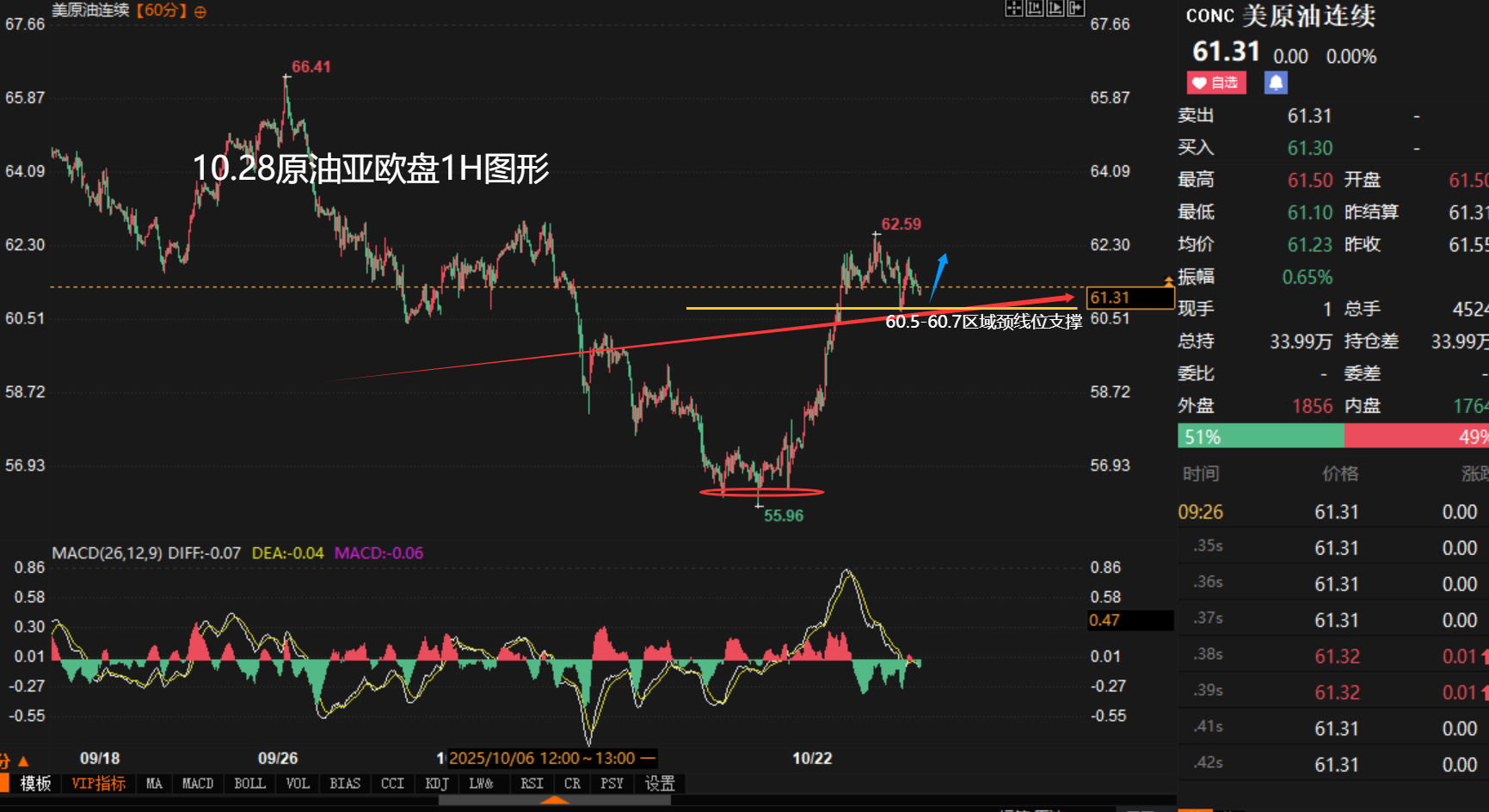 10-28[原油]10月28日【黄金原油】亚欧盘:原油日线级别震荡小阴延续多空反复,今日回踩依托60.7关口继续先多再看反弹上行延续