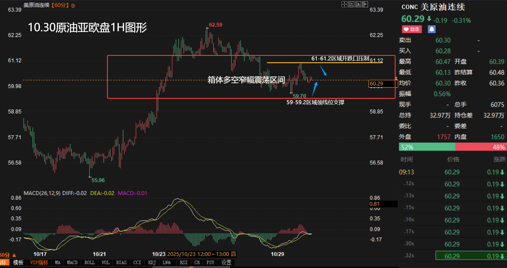 10-30[原油]10月30日【黄金原油】亚欧盘:原油日线级别冲高承压61关口压制回落震荡收盘延续压制偏空节奏,今日反抽依托60.8关口先空下看震荡回落调整