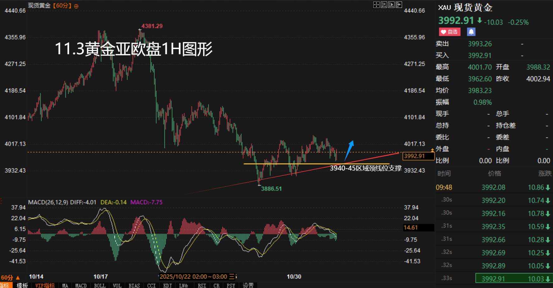 11-03[黄金]11月3日【黄金原油】亚欧盘:黄金上周五3999多4030扫止盈,日线级别震荡小阴不改整体强势震荡格局,今日回踩依托3940关口继续主多再看反弹回升