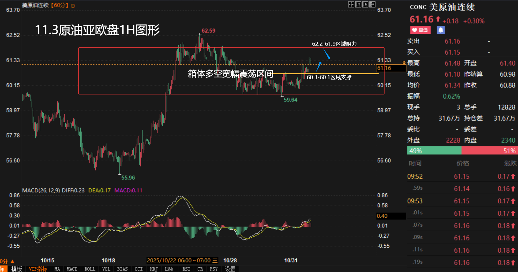 11-03[原油]11月3日【黄金原油】亚欧盘:原油日线级别震荡反复继续以时间换空间,今日依托60.3支撑61.9区域压制高空低多循环参与为主