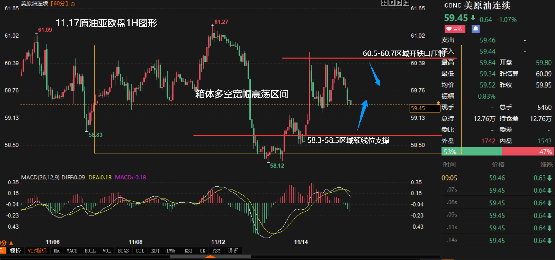 11-17[原油]11月17日【黄金原油】亚欧盘:原油日线级别震荡回升收阳不改整体压制偏空节奏,今日反抽依托60.5关口先空下看延续回落