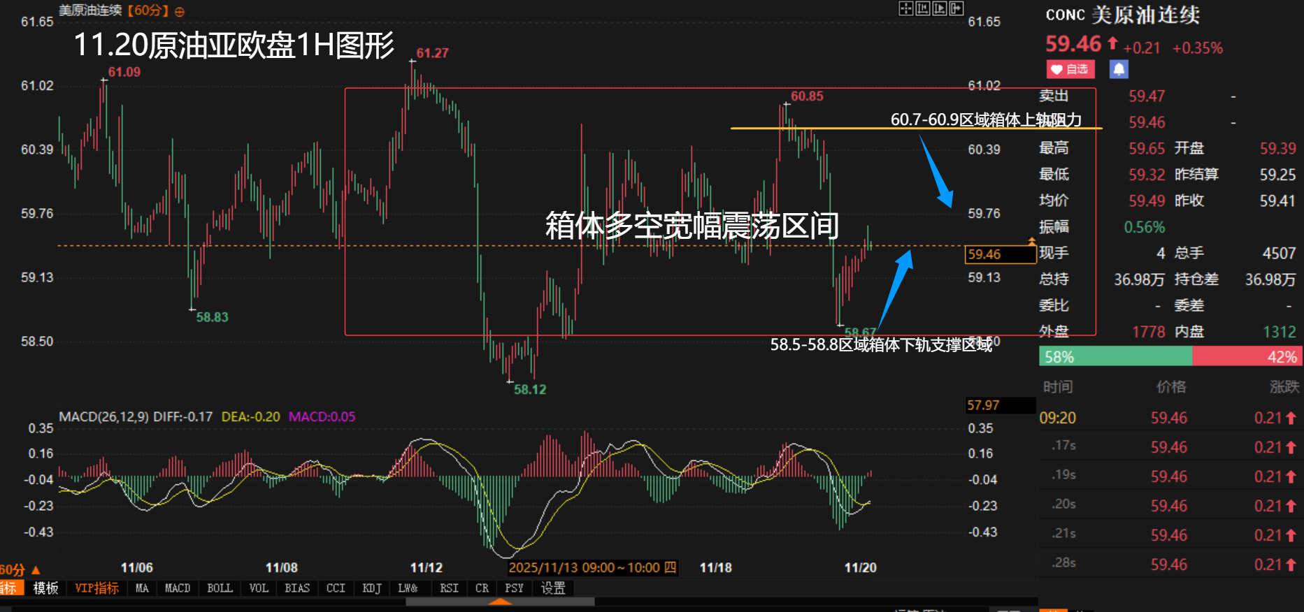 11-20[原油]11月20日【黄金原油】亚欧盘:原油日线级别压制回落中阴延续多空阴阳循环震荡节奏,今日回踩依托58.8关口先多再看反弹回升