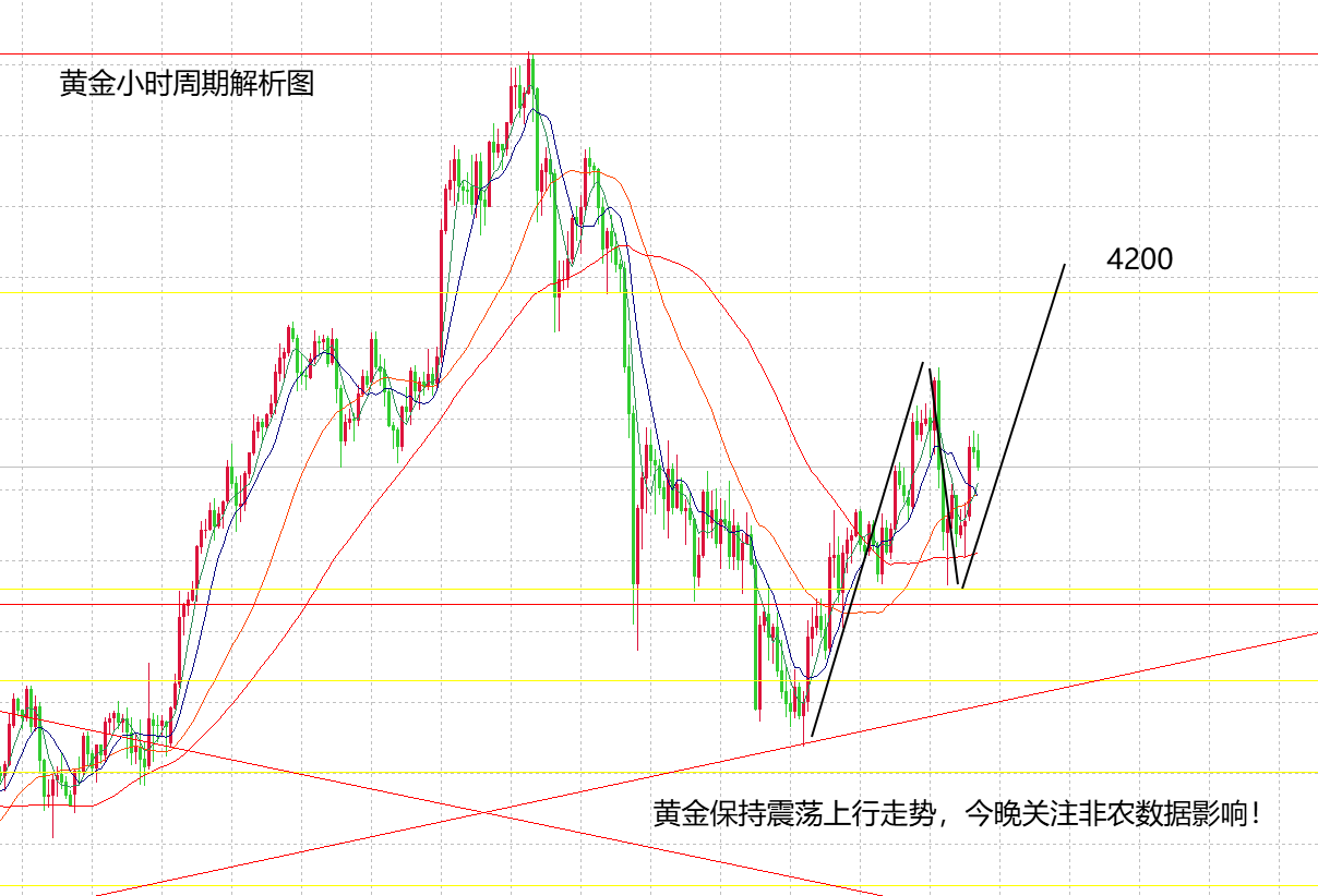上个交易确黄金看涨到4150附近,经过全天的上涨,黄金最高在4133附近,也算是走出了预期的力度,虽然没有达到目前点位,但跟随主力做多看涨利润还不错。强调,这个周期站稳4100后就是强势,但美盘开盘美元大涨,打压了黄金,促使黄金再次回来到4055低点,可以看到,黄金还是一个低位震荡的表现,并没有形成强势单边行情,那么,修改一下观点,黄金在4150之下看震荡,站稳4150之上再看单边力度至4300。暂时黄金保持在4150之下,也就是说是一个震荡走势,那么,今天继续看震荡上行,不过今晚有非农数据公布,是近两个月首次公开的数据,预计会有较大影响,如果数据利多黄金,上方或看4200,如果数据利空下方或再看4000。从技术面来看,日线周期还是保持连阳收线,并且k线还是在布林中轨支撑上,所以相对来讲,暂时黄金还是比较强势的,上方的压制点在4200,所以上方空间也比较大,看看今天是否能实现这种预期。H4周期的震荡就比较明显了,暂时布林收口,区间在4150/4020,午夜回来最低在4055,那么,短期内下方支撑4055,4020都是关键性支撑点,因此,今天的大小区间就出来了,大区间4200/4020,小区间4150/4050。早上开盘,黄金上涨至4110附近,隔夜的多单刚好止盈,今天回来关注4050支撑继续做多,上涨关注4100,4150,美盘则根据非农数据影响再判断涨跌空间。