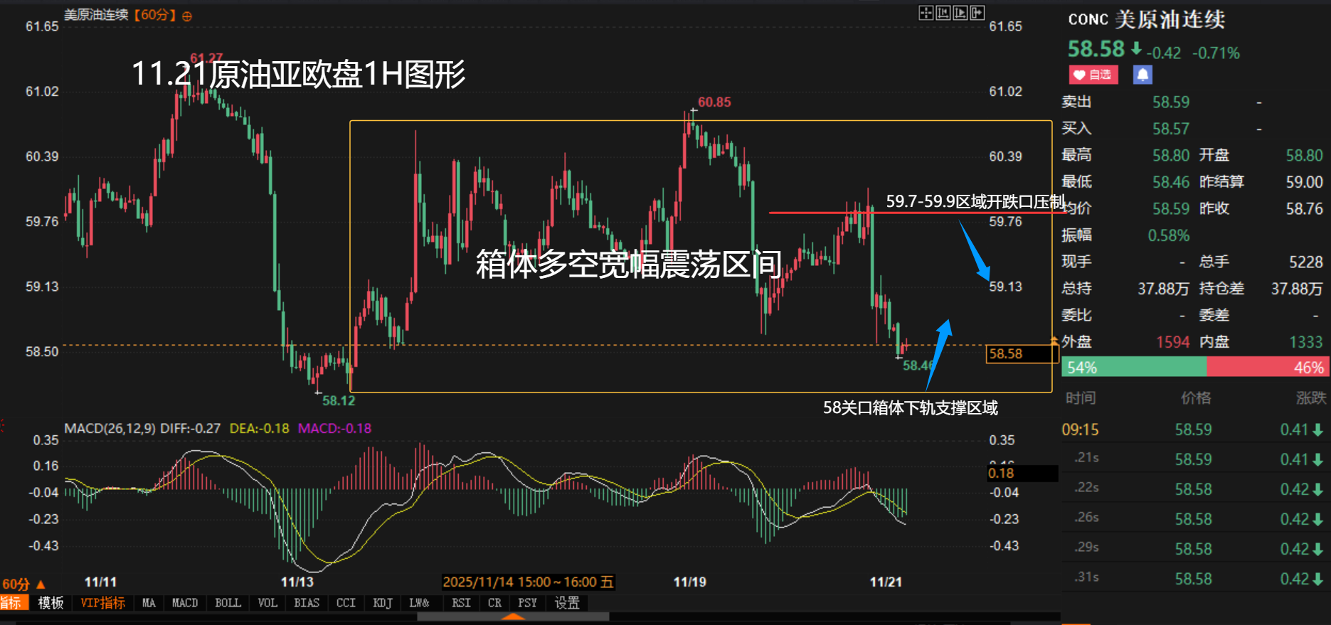 11-21[原油]11月21日【黄金原油】亚欧盘:原油日线级别压制回落中阴延续多空阴阳循环震荡节奏,今日企稳58关口先多再看反弹回升