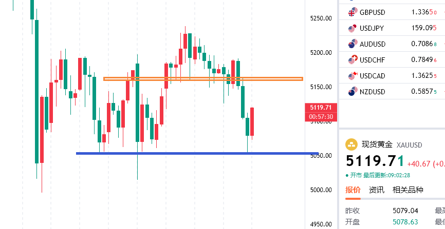 目前中东局势依旧紧张,伊朗坚守霍尔木兹海峡半步不让,虽然美一直在给压力,但是目前局势明显僵持住了,静待后续的变化情况,同时需要注意的是虽然中东原油供应受阻,但是美有意放宽对俄原油的管控力度,所以在整体原油的供应上应该还是会有保障,但是担忧情绪依旧会反复,而当下情况美联储降息的预期是在不断降温,给到美元美债支撑,黄金短期就显得有点力不从心,在反弹之后都没能延续,反而接连大跌调整,但是明显低位也有买盘介入,每次急跌之后都是迅速拉回,上个交易日黄金早盘从5136附近一路震荡反抽到5188附近回落修正,欧盘时段二次反抽在5191附近承压,美盘时段一路震荡下破,晚间一度跌破5100关口触及5054附近,然后迅速回升,整体还是一个反复的格局,上个交易日跟大家分享的5185/88附近空,还有5112附近多都是兑现到了目标位,只是跌破确实也超预期,思路继续执行即可,多空都不看延续!